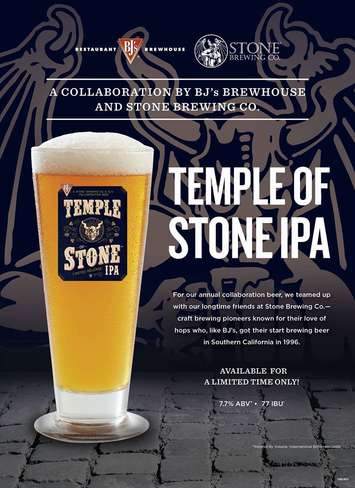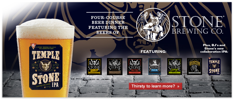 随着《Temple of Stone IPA》的发行,BJ 's将与Stone Brewing合作举办四道菜啤酒晚餐以石头啤酒为特色。这些啤酒将包括六种斯通啤酒连同新的合作。晚餐的价格是每人35美元外加提前付小费,或者是每人40美元外加当天的小费。