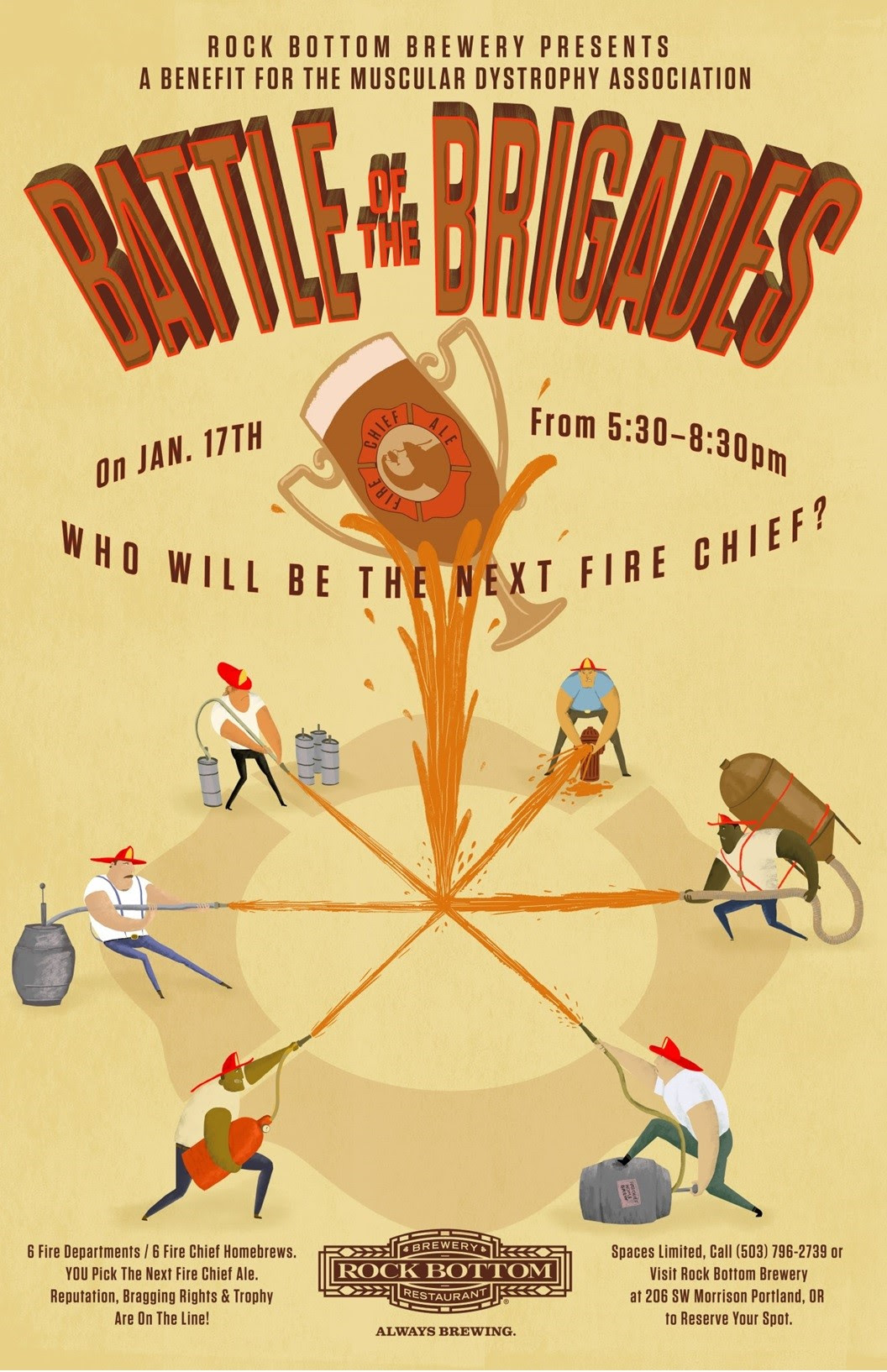 每年三月,Rock Bottom啤酒厂会从全国各地酿造他们的版本消防队长啤酒为MDA筹集资金。今年,你将可以帮助决定用来自波特兰、希尔斯伯勒、克拉克玛斯、温哥华和图阿拉廷山谷的消防员自制的五种食谱中的一种来酿造哪一种。