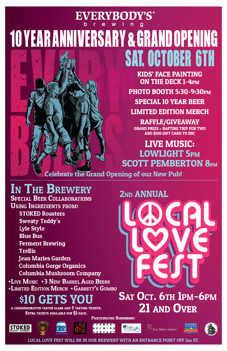 当天的庆祝活动将于下午1:00正式开始,届时将有每小时一次的啤酒特价活动,包括新的10周年啤酒、下午1:00-4:00的儿童面部绘画、下午5:30-9:30的照相亭和抽奖。下午5:00,Lowlight将进行现场音乐表演,随后Scott Pemberton将于晚上8:00进行现场音乐表演。