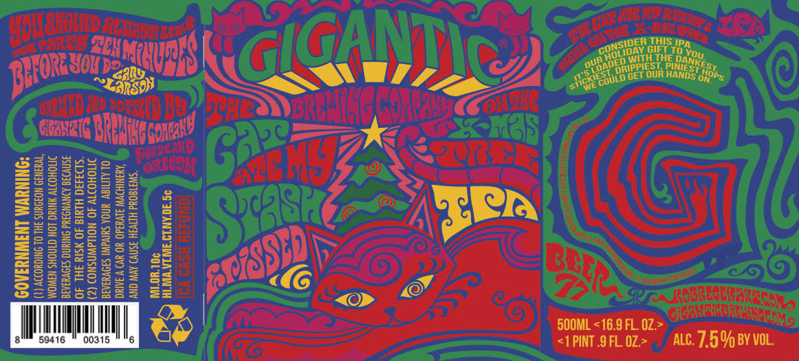 巨酿公司的艺术总监罗伯·雷格(Rob Reger)为the Cat Ate My Stash & Pissed on the christmas Tree IPA设计了迷幻标签艺术。Regar最出名的是创造了这个卡通人物艾米丽的奇怪.