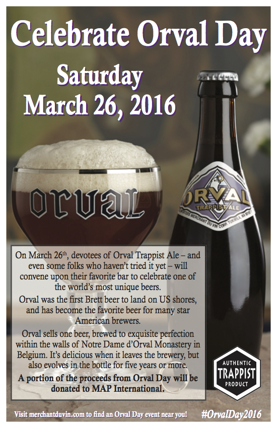 3月26日星期六,Merchant du Vin.,进口商orval trappist ale.将庆祝这么多人的比利时啤酒。在全国各地的许多顶级啤酒酒吧orval日将是使用Brettanomyces在美国销售的第一批啤酒的庆祝活动。来自orval日的一部分收益将捐赠给地图国际。星期六庆祝时使用Hashtag#Orvalday2016。