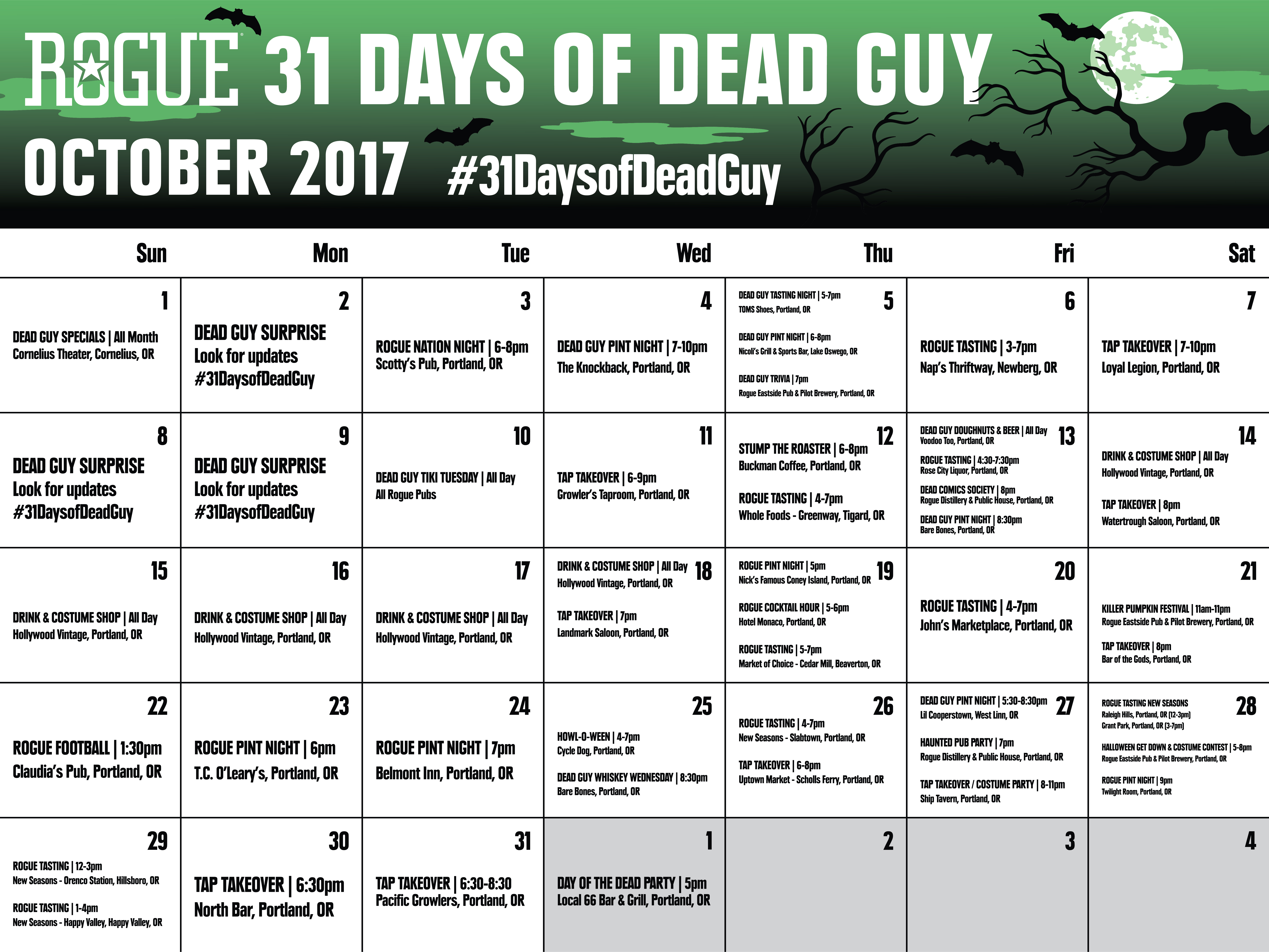 在10月和11月的第一天,流氓啤酒将庆祝31天的死人。流氓将在整个月的啤酒的啤酒的出生地烤制它最着名的啤酒,死亡的家伙啤酒。