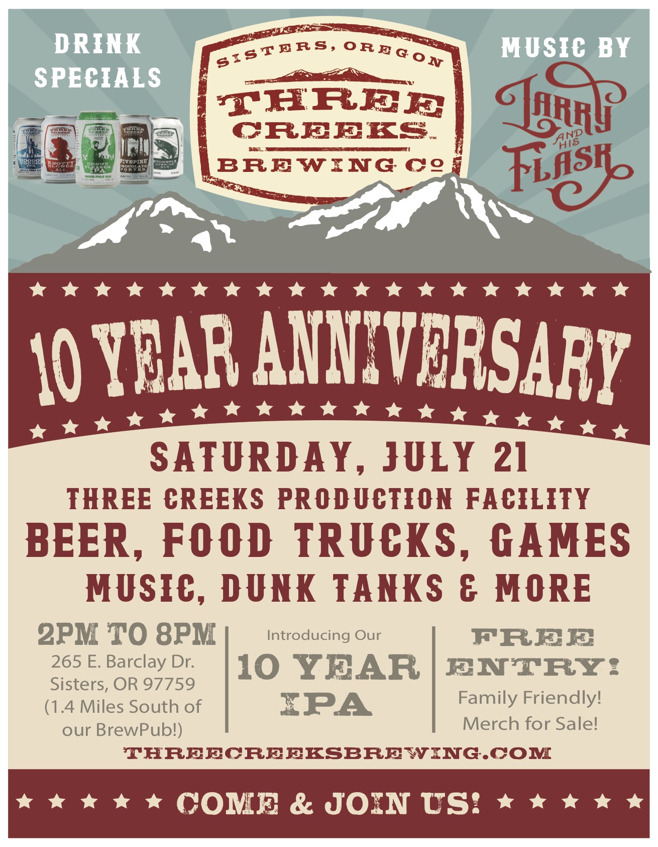 7月21日星期六,三个小溪酿造公司正在庆祝我们的10周年!加入我们的嘉年华般的氛围,扣篮,弹跳障碍障碍课程,更多!我们将有游戏,Larry和他的烧瓶,食品卡车,当然,啤酒展示了10年的伟大!带上你的朋友,带上你的家人!入场是免费的。