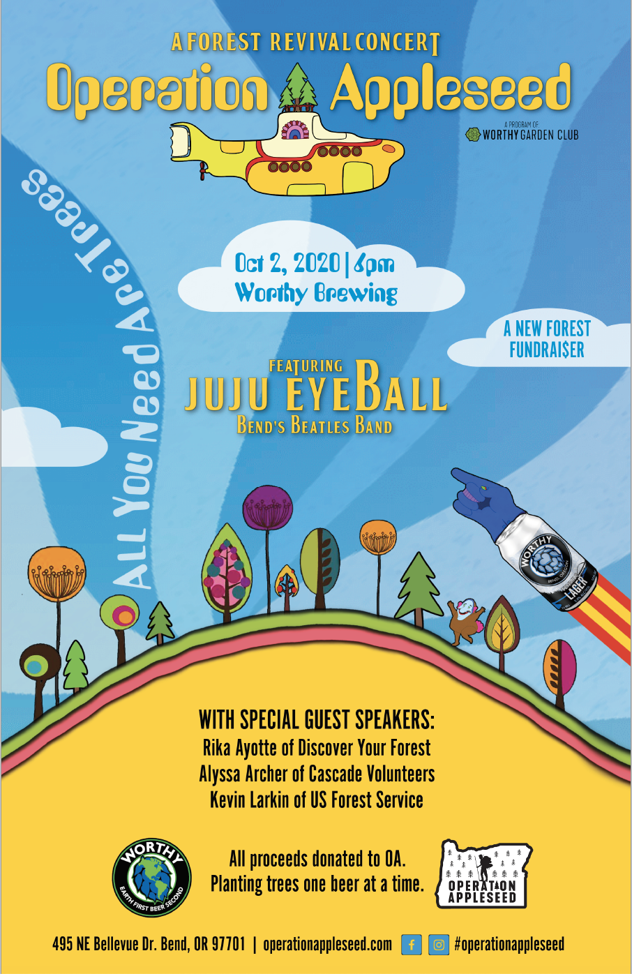 为了支持苹果籽行动,有价值的酝酿将举办一个森林复兴慈善音乐会10月2日星期五,本德的披头士翻唱乐队“Juju Eyeball”将亮相。筹集到的资金将用于实现苹果种子行动的目标,即到2023年在俄勒冈州种植100多万棵树。