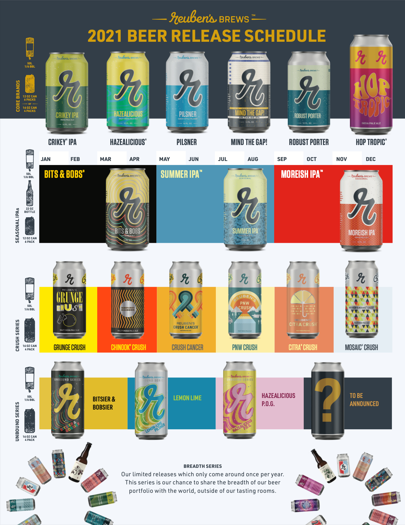 从中了解即将发生的事情鲁本啤酒因为它涉及到西雅图啤酒厂宣布其2021年啤酒发布日历. 今年的啤酒系列将包括五个系列的啤酒——核心品牌、季节性IPA、压榨系列、未绑定系列和宽度系列。这些啤酒将分布在太平洋西北部。