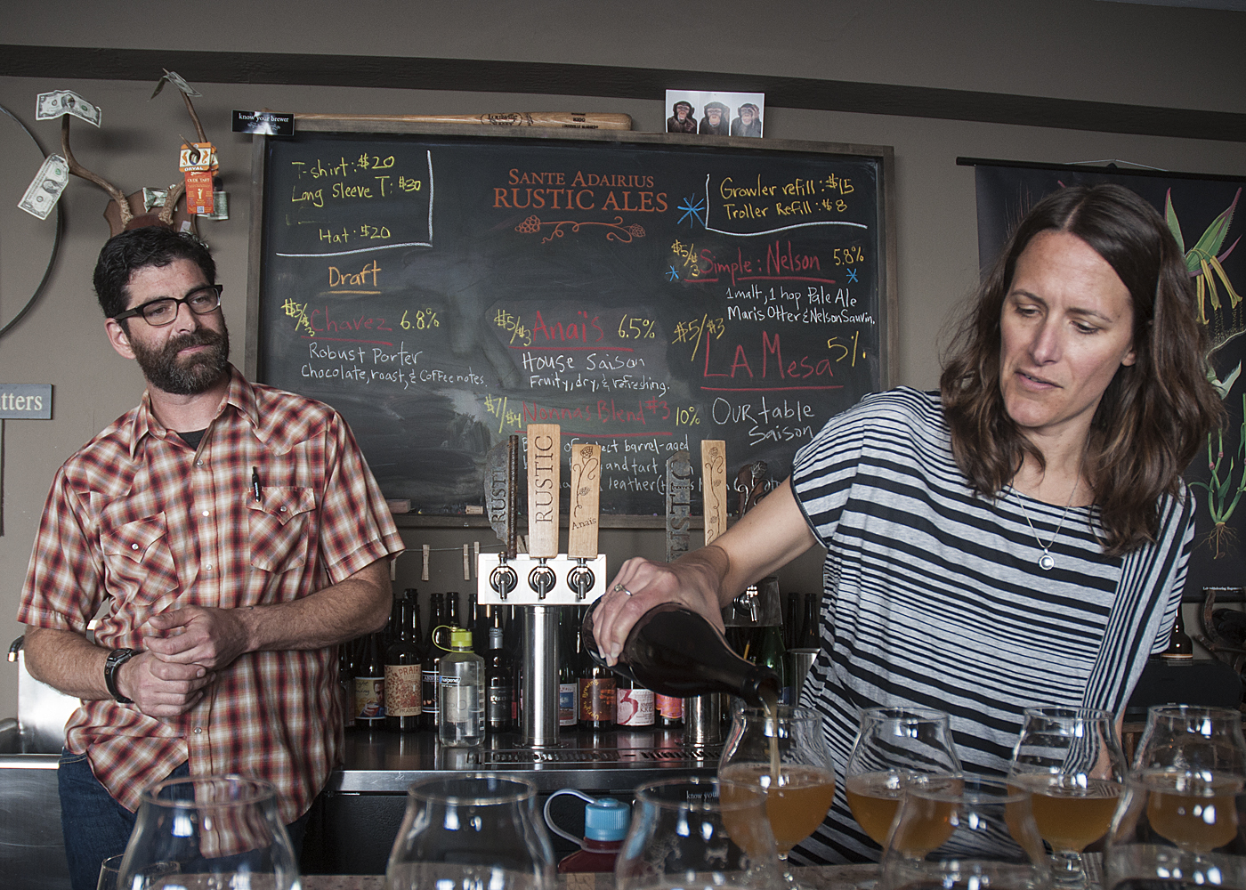 Sante Adairius提供的啤酒是超过十年的家庭酿造经验和与朋友分享的许多瓶好的精酿啤酒的顶峰。有些啤酒源于经过多次修改的自制配方,有些则源自围绕一瓶商业啤酒的鼓舞人心的对话。蒂姆在家酿行业有多年的经验,与配料一起工作,帮助客户开发家酿食谱,这让他能够凭直觉建立一个基础食谱。然而,使用替代酵母,如Brettanomyces和细菌并不是那么简单。在过去,他会将一份10加仑的自制啤酒分成两份,其中一半是纯发酵的,只使用一种酵母菌,另一半则是“细菌”(如布雷特菌(Brett)、乳杆菌(Lactobacillus)和片球菌(Pediococcus))。如果一个批次是坏的,它就被丢弃,如果是好的,它就被消耗掉。几年后,他们从奥克兰搬了出来。在收拾行李的时候,阿黛尔发现了一些意想不到的事情。“我们有一个阁楼,我以为我们在上面放了桌子和其他东西,但那里有一大堆瓶子!”它们都是酸的。”她声称。