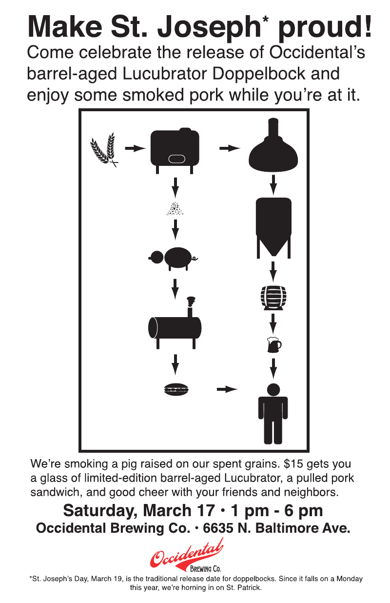 这是最后一刻,但我们这周六有个活动来释放我们的桶状陈年二重身,为了这个活动,我们还抽了一只用我们用过的谷物养大的整头猪。我们会倒桶陈酿的Lucubrator和我们的普通啤酒。15美元可以买一杯限量版的二重身和一个猪肉三明治。2012年3月17日,星期六下午1-6点。——丹·恩格勒(dan Engler),西方啤酒公司(Occidental brewery)联合创始人